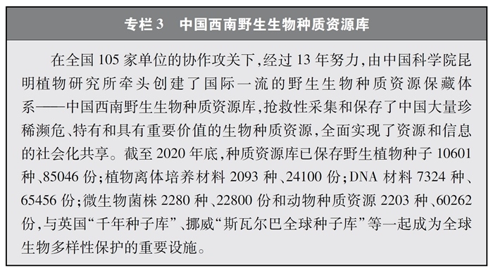 加快重要生物遺傳資源收集保存和利用。中國高度重視生物資源保護(hù),近年來在生物資源調(diào)查、收集、保存等方面取得較大進(jìn)展。實(shí)施戰(zhàn)略生物資源計(jì)劃專項(xiàng),完善生物資源收集收藏平臺(tái),建立種質(zhì)資源創(chuàng)新平臺(tái)、遺傳資源衍生庫和天然化合物轉(zhuǎn)化平臺(tái),持續(xù)加強(qiáng)野生生物資源保護(hù)和利用。實(shí)施一批種質(zhì)資源保護(hù)和育種創(chuàng)新項(xiàng)目,截至2020年底,形成了以國家作物種質(zhì)長(zhǎng)期庫及其復(fù)份庫為核心、10座中期庫與43個(gè)種質(zhì)圃為支撐的國家作物種質(zhì)資源保護(hù)體系,建立了199個(gè)國家級(jí)畜禽遺傳資源保種場(chǎng)(區(qū)、庫),為90%以上的國家級(jí)畜禽遺傳資源保護(hù)名錄品種建立了國家級(jí)保種單位,長(zhǎng)期保存作物種質(zhì)資源52萬余份、畜禽遺傳資源96萬份。建設(shè)99個(gè)國家級(jí)林木種質(zhì)資源保存庫,以及新疆、山東2個(gè)國家級(jí)林草種質(zhì)資源設(shè)施保存庫國家分庫,保存林木種質(zhì)資源4.7萬份。建設(shè)31個(gè)藥用植物種質(zhì)資源保存圃和2個(gè)種質(zhì)資源庫,保存種子種苗1.2萬多份。