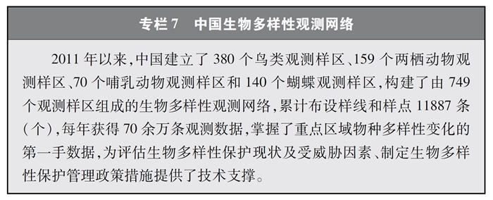 完善監(jiān)測(cè)觀測(cè)網(wǎng)絡(luò)。中國建立起各類生態(tài)系統(tǒng)、物種的監(jiān)測(cè)觀測(cè)網(wǎng)絡(luò),在生物多樣性理論研究、技術(shù)示范與推廣以及物種與生境保護(hù)方面發(fā)揮了重要作用,為科研、教育、科普、生產(chǎn)等各領(lǐng)域提供了多樣化的信息服務(wù)與決策支持。其中,中國生態(tài)系統(tǒng)研究網(wǎng)絡(luò)(CERN)、國家陸地生態(tài)系統(tǒng)定位觀測(cè)研究網(wǎng)絡(luò)(CTERN)涵蓋所有生態(tài)系統(tǒng)和要素,中國生物多樣性監(jiān)測(cè)與研究網(wǎng)絡(luò)(Sino BON)覆蓋動(dòng)物、植物、微生物等多種生物類群,中國生物多樣性觀測(cè)網(wǎng)絡(luò)(China BON)構(gòu)建了覆蓋全國的指示物種類群觀測(cè)樣區(qū)。