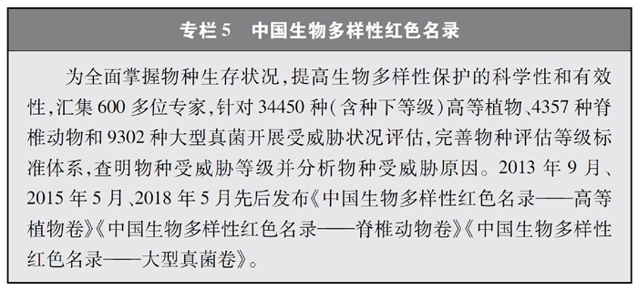 開展全國生物多樣性調(diào)查與評(píng)估。大力推進(jìn)生物多樣性保護(hù)重大工程實(shí)施,結(jié)合自然資源調(diào)查、生態(tài)系統(tǒng)監(jiān)測(cè)評(píng)估等工作,不斷完善生物多樣性調(diào)查與評(píng)估能力,首次將生物多樣性指標(biāo)納入生態(tài)質(zhì)量綜合評(píng)價(jià)指標(biāo)體系,引導(dǎo)地方加強(qiáng)生態(tài)文明建設(shè)與生物多樣性保護(hù)。開展自然資源調(diào)查,包括森林、草原、水、濕地、荒漠、海洋等,建立自然資源調(diào)查評(píng)價(jià)監(jiān)測(cè)制度。構(gòu)建了涵蓋2376個(gè)縣級(jí)行政單元、樣線總長(zhǎng)超過3.4萬公里的物種分布數(shù)據(jù)庫,建立物種資源調(diào)查及收集信息平臺(tái),準(zhǔn)確反映野生動(dòng)植物空間分布狀況。完成長(zhǎng)江經(jīng)濟(jì)帶、京津冀等國家戰(zhàn)略區(qū)域180多個(gè)縣級(jí)行政區(qū)生物多樣性調(diào)查與評(píng)估。組織開展近海漁業(yè)資源調(diào)查,初步掌握近海漁業(yè)資源狀況。陸續(xù)發(fā)布《中國植物紅皮書》《中國瀕危動(dòng)物紅皮書》《中國物種紅色名錄》《中國生物多樣性紅色名錄》,基本掌握生物多樣性總體情況,為加強(qiáng)生物多樣性保護(hù)奠定了科學(xué)基礎(chǔ)。