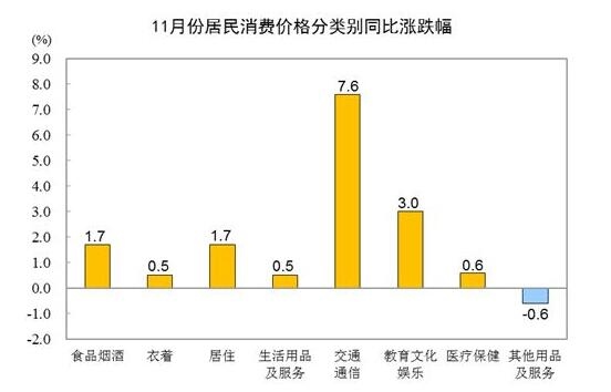 其他七大類(lèi)價(jià)格同比六漲一降。其中,交通通信、教育文化娛樂(lè)、居住價(jià)格分別上漲7.6%、3.0%和1.7%,醫(yī)療保健、衣著、生活用品及服務(wù)價(jià)格分別上漲0.6%、0.5%和0.5%;其他用品及服務(wù)價(jià)格下降0.6%。