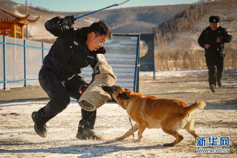 警犬訓導員和警犬進行撲咬訓練。新華網(wǎng)發(fā)(包青松攝)