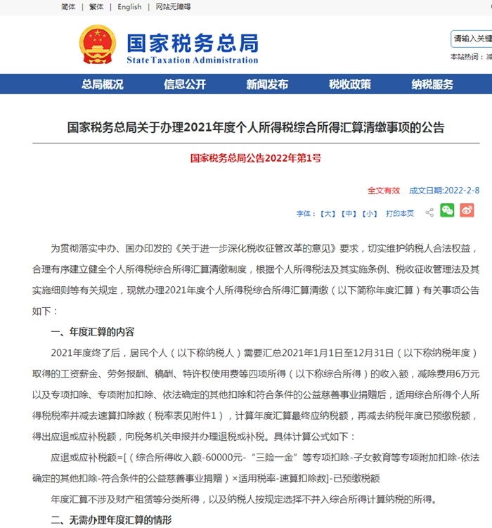 為貫徹落實中辦、國辦印發(fā)的《關(guān)于進(jìn)一步深化稅收征管改革的意見》要求,切實維護(hù)納稅人合法權(quán)益,合理有序建立健全個人所得稅綜合所得匯算清繳制度,根據(jù)個人所得稅法及其實施條例、稅收征收管理法及其實施細(xì)則等有關(guān)規(guī)定,現(xiàn)就辦理2021年度個人所得稅綜合所得匯算清繳(以下簡稱年度匯算)有關(guān)事項公告如下: