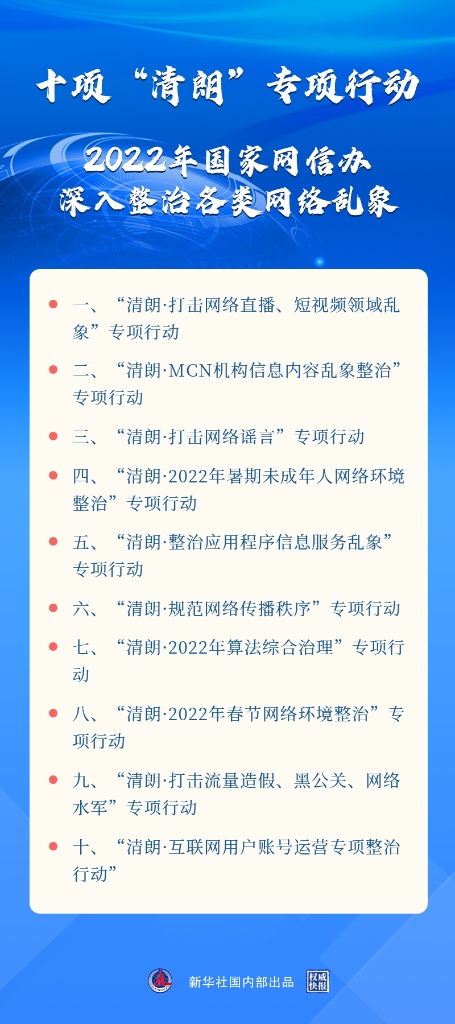 新華社北京3月17日電(記者王思北)記者17日從國新辦舉行的新聞發(fā)布會獲悉,2022年“清朗”系列專項(xiàng)行動將重點(diǎn)開展打擊網(wǎng)絡(luò)謠言,打擊網(wǎng)絡(luò)直播、短視頻領(lǐng)域亂象,算法綜合治理,暑期未成年人網(wǎng)絡(luò)環(huán)境整治等十方面任務(wù)?! ?/p>