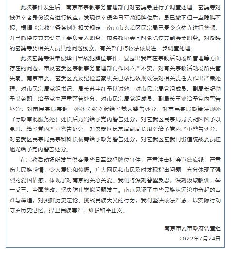 關(guān)于南京玄奘寺供奉侵華日軍戰(zhàn)犯牌位事件調(diào)查處理情況的通報