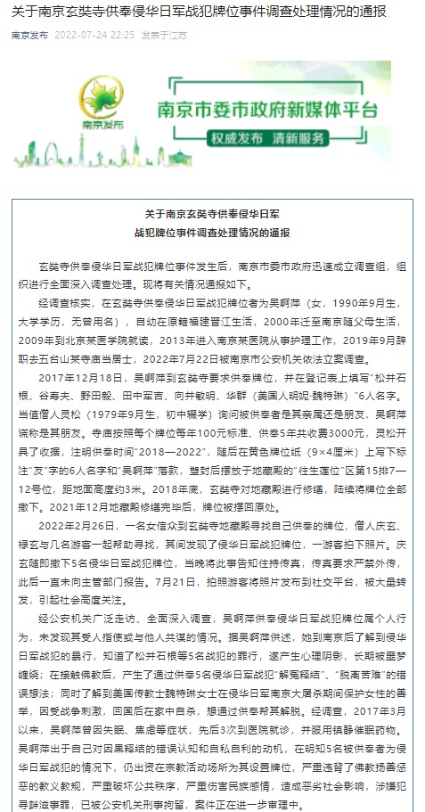 經(jīng)調(diào)查核實,在玄奘寺供奉侵華日軍戰(zhàn)犯牌位者為吳啊萍(女,1990年9月生,大學(xué)學(xué)歷,無曾用名),自幼在原籍福建晉江生活,2000年遷至南京隨父母生活,2009年到北京某醫(yī)學(xué)院就讀,2013年進(jìn)入南京某醫(yī)院從事護(hù)理工作,2019年9月辭職去五臺山某寺廟當(dāng)居士,2022年7月22日被南京市公安機(jī)關(guān)依法立案調(diào)查。