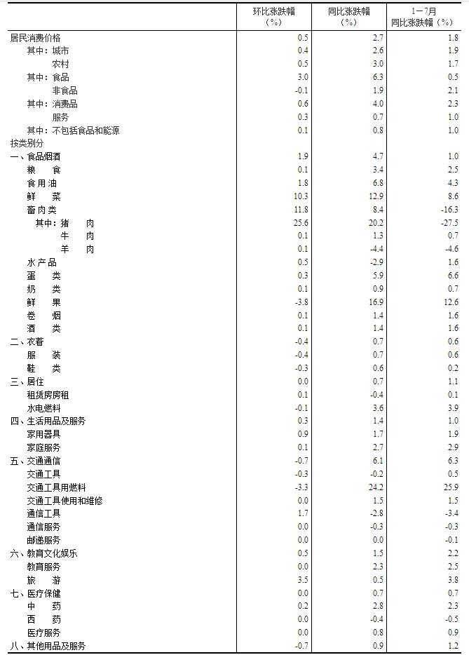 7月份,食品煙酒類價(jià)格同比上漲4.7%,影響CPI(居民消費(fèi)價(jià)格指數(shù))上漲約1.28個(gè)百分點(diǎn)。食品中,鮮果價(jià)格上漲16.9%,影響CPI上漲約0.30個(gè)百分點(diǎn);鮮菜價(jià)格上漲12.9%,影響CPI上漲約0.24個(gè)百分點(diǎn);畜肉類價(jià)格上漲8.4%,影響CPI上漲約0.27個(gè)百分點(diǎn),其中豬肉價(jià)格上漲20.2%,影響CPI上漲約0.27個(gè)百分點(diǎn);蛋類價(jià)格上漲5.9%,影響CPI上漲約0.04個(gè)百分點(diǎn);糧食價(jià)格上漲3.4%,影響CPI上漲約0.06個(gè)百分點(diǎn);水產(chǎn)品價(jià)格下降2.9%,影響CPI下降約0.06個(gè)百分點(diǎn)。