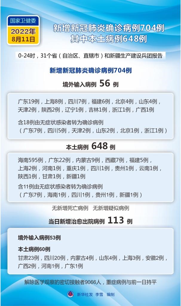 新華社北京8月12日電 國家衛(wèi)生健康委員會8月12日通報,8月11日0—24時,31個省(自治區(qū)、直轄市)和新疆生產(chǎn)建設(shè)兵團(tuán)報告新增確診病例704例。其中境外輸入病例56例(廣東19例,上海8例,四川7例,福建6例,北京4例,山東4例,天津2例,陜西2例,遼寧1例,吉林1例,浙江1例,廣西1例),含18例由無癥狀感染者轉(zhuǎn)為確診病例(廣東7例,四川5例,天津2例,山東2例,北京1例,浙江1例);本土病例648例(海南595例,廣東22例,內(nèi)蒙古9例,西藏7例,福建5例,上海2例,河南1例,重慶1例,四川1例,貴州1例,云南1例,陜西1例,甘肅1例,新疆1例),含11例由無癥狀感染者轉(zhuǎn)為確診病例(廣東7例,海南1例,四川1例,貴州1例,新疆1例)。無新增死亡病例。無新增疑似病例。