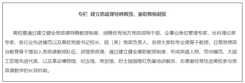 14.建設(shè)專兼結(jié)合的師資隊(duì)伍。各地各校嚴(yán)格按照要求配備建強(qiáng)高校專職思政課教師、輔導(dǎo)員隊(duì)伍,提高中小學(xué)專職思政課教師比例,實(shí)行思政課特聘教授、兼職教師制度,積極聘請(qǐng)黨政領(lǐng)導(dǎo)、科學(xué)家、老同志、先進(jìn)模范等擔(dān)任思政課兼職教師。深入實(shí)施馬克思主義學(xué)院院長(zhǎng)(書(shū)記)培養(yǎng)工程,通過(guò)集中培養(yǎng)培訓(xùn)、委托重大項(xiàng)目、加強(qiáng)實(shí)踐鍛煉、開(kāi)展國(guó)際國(guó)內(nèi)訪學(xué)等方式,培養(yǎng)一批青年馬克思主義理論家。