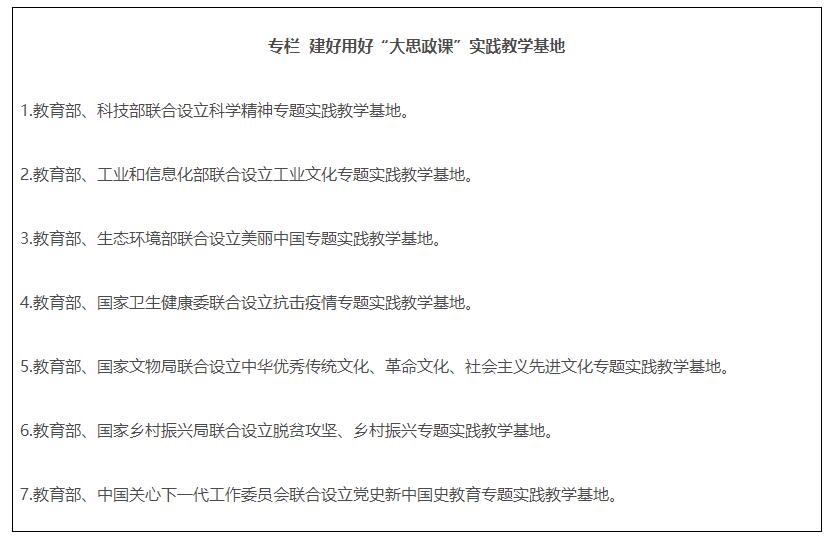 21.強(qiáng)化統(tǒng)籌協(xié)調(diào)。教育部、中央宣傳部做好“大思政課”建設(shè)的總體謀劃。中央網(wǎng)信辦指導(dǎo)做好“大思政課”全媒體宣傳??萍疾?、工業(yè)和信息化部、生態(tài)環(huán)境部、國(guó)家衛(wèi)生健康委、國(guó)家文物局、國(guó)家鄉(xiāng)村振興局、中國(guó)關(guān)心下一代工作委員會(huì)等部門(mén),加強(qiáng)對(duì)基地的指導(dǎo)和建設(shè),切實(shí)發(fā)揮好基地的育人功能。