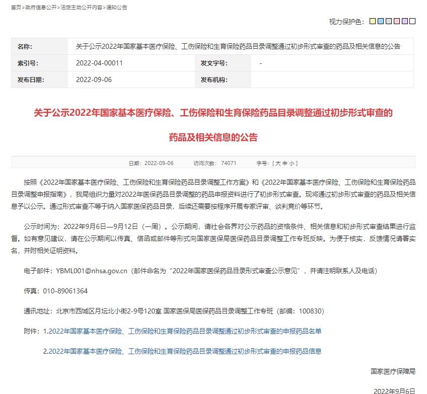 根據(jù)2022年國家基本醫(yī)療保險、工傷保險和生育保險藥品目錄(以下簡稱國家醫(yī)保藥品目錄)調(diào)整工作安排,國家醫(yī)保局近期對申報藥品進行了初步形式審查,并對通過審查的藥品和信息進行了公示?,F(xiàn)就有關(guān)工作情況解讀如下。