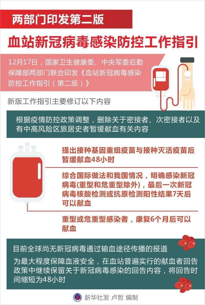 與2021年《血站新冠肺炎疫情常態(tài)化防控工作指引》相比,新版工作指引主要修訂以下內(nèi)容:根據(jù)疫情防控政策調(diào)整,新版工作指引刪除關(guān)于密接者、次密接者以及有中高風(fēng)險(xiǎn)區(qū)旅居史者暫緩獻(xiàn)血有關(guān)內(nèi)容。提出接種基因重組疫苗與接種滅活疫苗后暫緩獻(xiàn)血48小時(shí)。綜合國際做法和我國情況,明確感染新冠病毒(重型和危重型除外),最后一次新冠病毒核酸檢測或抗原檢測陽性結(jié)果7天后可以獻(xiàn)血;重型或危重型感染者,康復(fù)6個(gè)月后可以獻(xiàn)血。