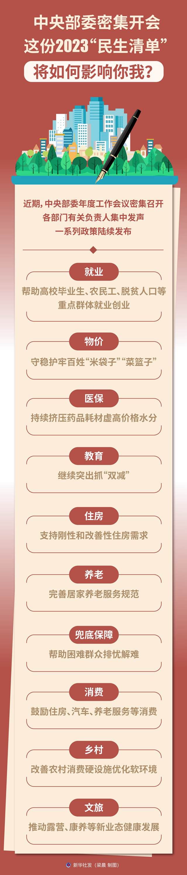 近期,中央部委年度工作會議密集召開,各部門有關(guān)負(fù)責(zé)人集中發(fā)聲,一系列政策陸續(xù)發(fā)布?!靶氯A視點(diǎn)”記者梳理了多個領(lǐng)域2023年聚焦民生關(guān)切的重要舉措。