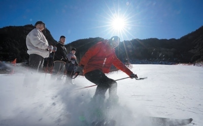 黑崖溝村開設(shè)了高山滑雪場,教練為孩子們示范滑雪動作。