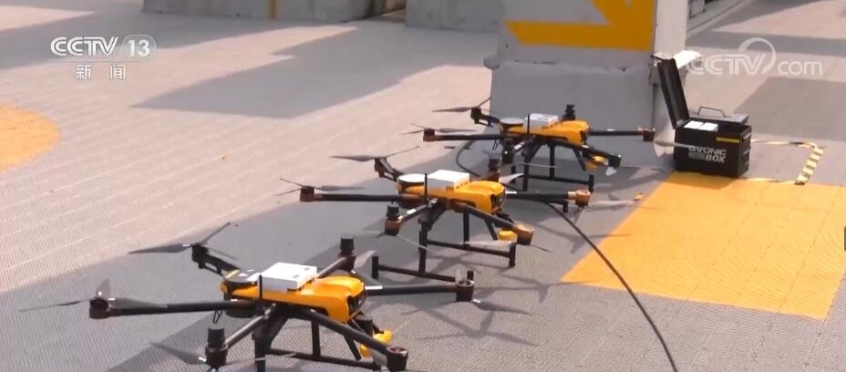 中午11點(diǎn),在深圳一家商場(chǎng)頂層的平臺(tái)上,一架架無(wú)人機(jī)整齊停放在“停機(jī)坪”,工作人員將傳送帶上的外賣掃碼、裝箱,再掛上無(wú)人機(jī)就準(zhǔn)備起飛。在幾公里外的目的地,有智能空投柜等待接收,降落后顧客憑取件碼取餐,方便安全。