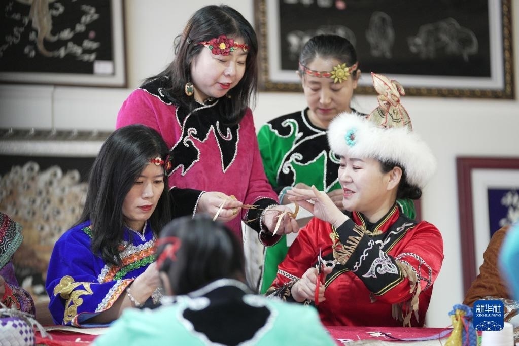2月22日,在黑龍江省同江市非物質(zhì)文化遺產(chǎn)展示館,劉蕾(右一)在學(xué)習(xí)魚皮制作技藝。新華社記者 王建威 攝