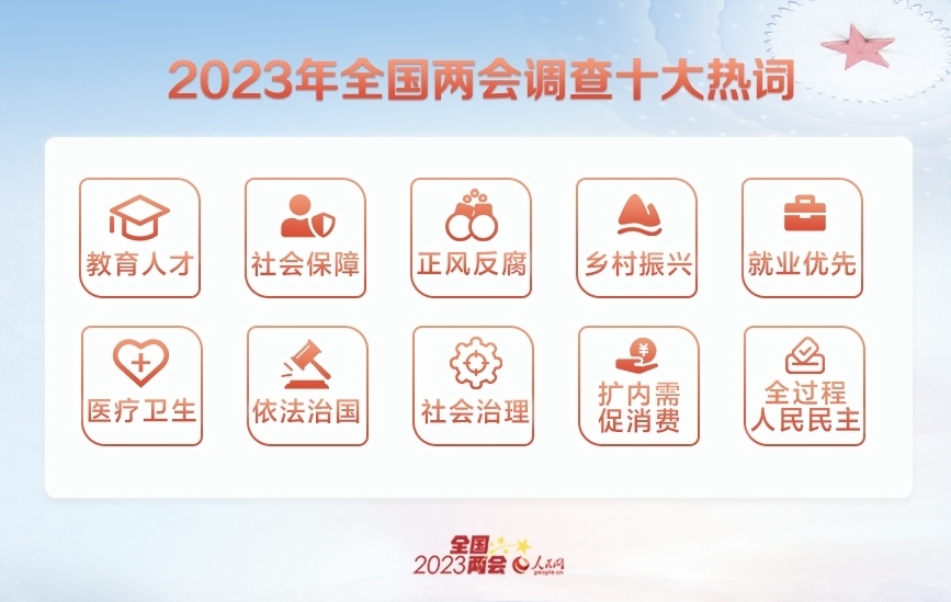 經(jīng)過(guò)網(wǎng)友投票,“教育人才”“社會(huì)保障”“正風(fēng)反腐”“鄉(xiāng)村振興”“就業(yè)優(yōu)先”“醫(yī)療衛(wèi)生”“依法治國(guó)”“社會(huì)治理”“擴(kuò)內(nèi)需促消費(fèi)”“全過(guò)程人民民主”入選十大熱詞。
