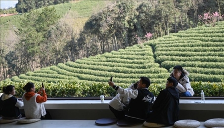 △游客在浙江省安吉縣黃杜村萬畝茶園邊的咖啡館留影(2月21日攝)。