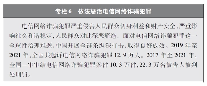 加大網(wǎng)絡(luò)犯罪懲治力度。隨著互聯(lián)網(wǎng)技術(shù)的快速發(fā)展,傳統(tǒng)犯罪加速向以互聯(lián)網(wǎng)為媒介的非接觸式犯罪轉(zhuǎn)變,電信網(wǎng)絡(luò)詐騙、網(wǎng)絡(luò)賭博、網(wǎng)絡(luò)淫穢色情等涉網(wǎng)違法犯罪多發(fā)。中國(guó)依法辦理新型網(wǎng)絡(luò)犯罪案件。連續(xù)多年開展“凈網(wǎng)行動(dòng)”,嚴(yán)厲打擊群眾反映強(qiáng)烈的黑客攻擊破壞、侵犯公民個(gè)人信息等違法犯罪活動(dòng)。持續(xù)推進(jìn)“云劍”“斷卡”“斷流”“拔釘”等專項(xiàng)行動(dòng),打擊套路貸、校園貸、“以房養(yǎng)老”、“投資養(yǎng)老”等電信網(wǎng)絡(luò)詐騙犯罪,依法懲處為電信網(wǎng)絡(luò)詐騙犯罪團(tuán)伙提供互聯(lián)網(wǎng)接入、域名注冊(cè)、服務(wù)器托管、移動(dòng)互聯(lián)網(wǎng)應(yīng)用程序制作開發(fā)、網(wǎng)絡(luò)支付、引流推廣等服務(wù)支撐的黑灰產(chǎn)業(yè)。完善國(guó)家反詐大數(shù)據(jù)平臺(tái)和反詐移動(dòng)互聯(lián)網(wǎng)應(yīng)用程序,建設(shè)國(guó)家涉詐黑樣本庫,完善快速止付凍結(jié)機(jī)制、涉詐資金返還機(jī)制。堅(jiān)決打擊網(wǎng)絡(luò)賭博犯罪行為,從嚴(yán)治理網(wǎng)絡(luò)淫穢色情。網(wǎng)絡(luò)犯罪治理工作取得明顯成效,人民群眾安全感有效提升,社會(huì)更加和諧穩(wěn)定。