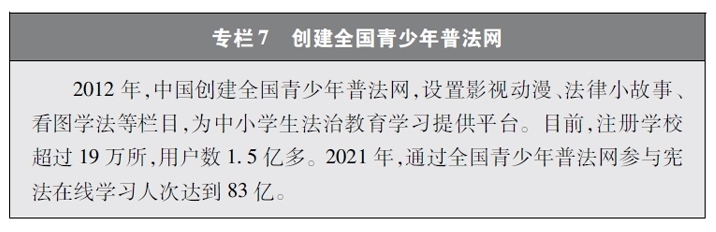 加強(qiáng)青少年網(wǎng)絡(luò)法治宣傳教育。青少年是祖國(guó)的未來、民族的希望。青少年網(wǎng)民在中國(guó)網(wǎng)民中的占比逐步增長(zhǎng)。作為互聯(lián)網(wǎng)的“原住民”,青少年是網(wǎng)上學(xué)習(xí)、交流、生活最活躍的參與者、實(shí)踐者,其合法權(quán)益也更易受到網(wǎng)絡(luò)違法活動(dòng)的侵害。中國(guó)從保護(hù)青少年網(wǎng)絡(luò)權(quán)益,促進(jìn)青少年健康成長(zhǎng)、全面發(fā)展出發(fā),遵循青少年身心發(fā)展規(guī)律,貼近青少年學(xué)習(xí)生活實(shí)際,聚焦網(wǎng)絡(luò)沉迷、網(wǎng)絡(luò)欺凌、網(wǎng)絡(luò)淫穢色情信息等重點(diǎn)問題,通過普法微綜藝、兒童普法話劇、網(wǎng)絡(luò)普法故事廣播、網(wǎng)絡(luò)普法云課堂、學(xué)法用法知識(shí)競(jìng)賽、法治副校長(zhǎng)進(jìn)校園、編寫網(wǎng)絡(luò)普法讀本等生動(dòng)活潑、豐富多彩的形式開展法治宣傳教育,逐步形成了政府、社會(huì)、學(xué)校、家庭相結(jié)合的法治宣傳教育格局,為提升青少年網(wǎng)民法治意識(shí)和網(wǎng)絡(luò)安全素養(yǎng)提供了全面保障。