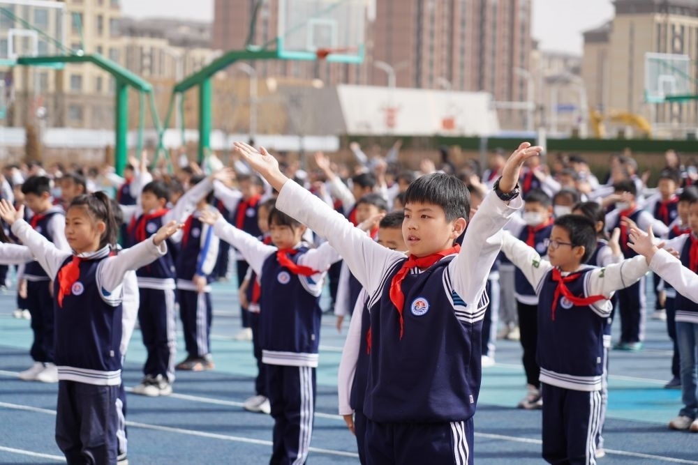 雄安新區(qū)容西片區(qū)云溪小學的學生在操場上做操(3月23日攝)。