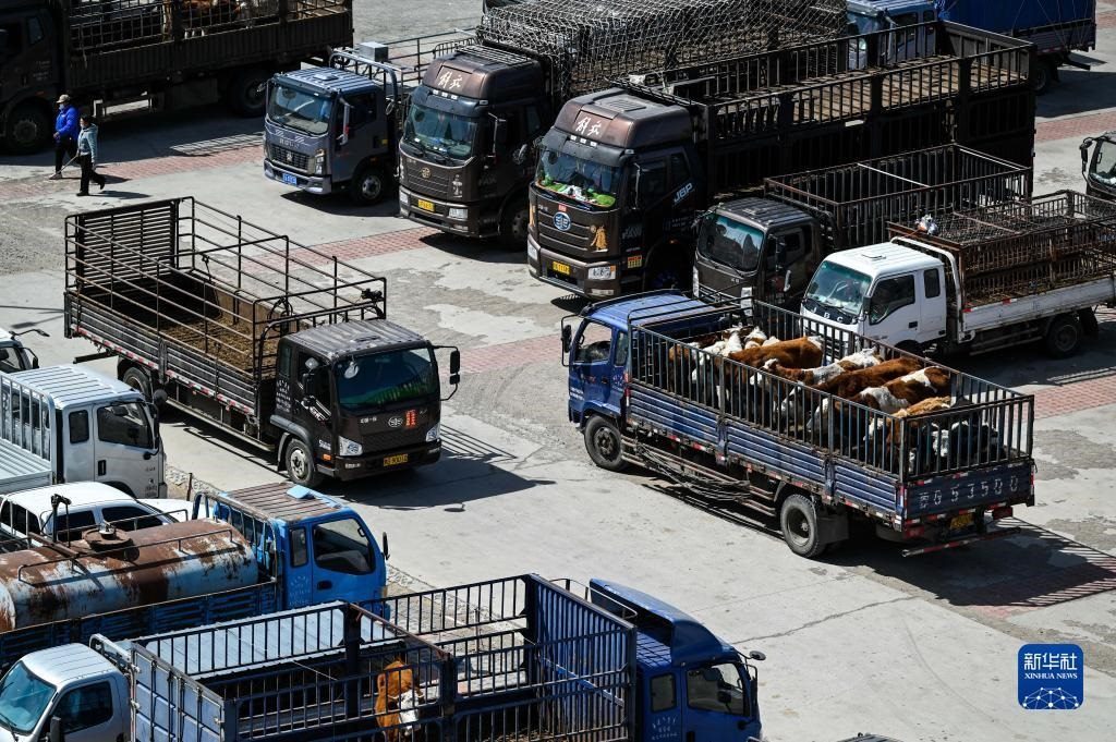 4月12日,內(nèi)蒙古通遼市科爾沁左翼中旗舍伯吐鎮(zhèn)成峰牲畜交易市場里一片繁忙景象,1000余輛貨運(yùn)車整齊排列,1萬余頭黃牛正等待被交易。據(jù)介紹,這個(gè)交易市場年交易80萬頭肉牛,交易額可達(dá)80億元。今年以來,當(dāng)?shù)嘏J行星橹饾u轉(zhuǎn)好,來自遼寧、吉林、山東等地的買家再次聚集于此,帶動(dòng)了養(yǎng)殖戶增收。新華社記者 連振 攝