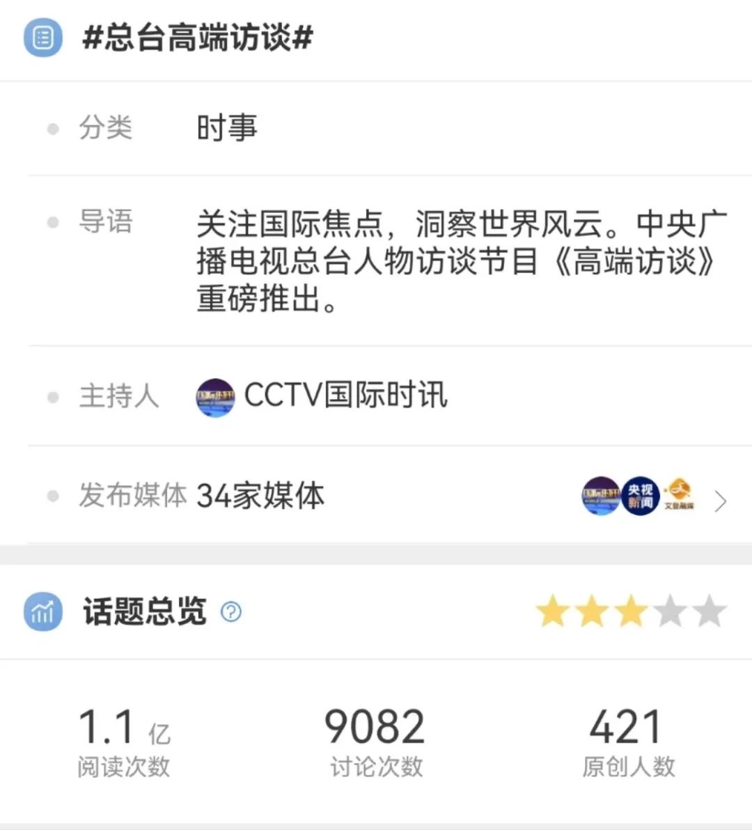 在充分調(diào)研的基礎(chǔ)上,《高端訪談》的采訪敢于碰真問題、硬問題,緊扣當(dāng)下熱點,以觀點鮮明、針對性強(qiáng)、易于傳播的重磅采訪報道主動設(shè)置議題,奮力提升中國聲音在國際輿論場中的話語權(quán)。
