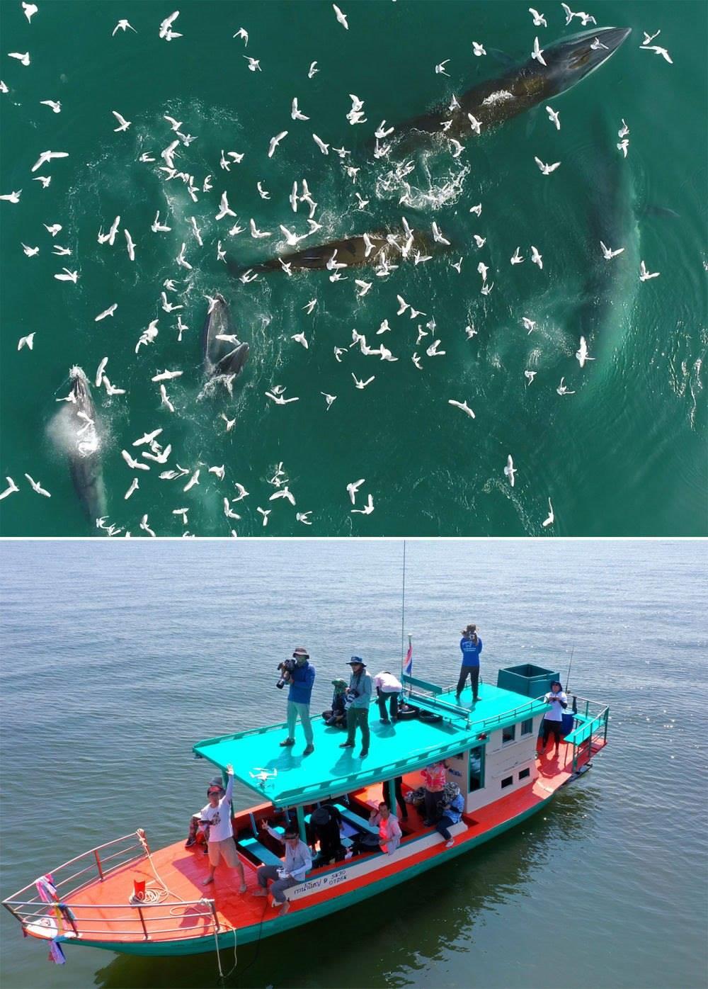 (拼版照片)上圖:布氏鯨在中國(guó)廣西潿洲島附近海域捕食(2022年2月22日攝)。下圖:中泰兩國(guó)科研人員在泰國(guó)灣對(duì)布氏鯨進(jìn)行聯(lián)合調(diào)查(2019年10月25日攝)。中泰兩國(guó)科研人員攜手研究保護(hù)布氏鯨這個(gè)近岸大型鯨類,圍繞布氏鯨調(diào)查技術(shù)、調(diào)查方法以及其他海洋哺乳動(dòng)物的研究和數(shù)據(jù)處理方法進(jìn)行交流與合作。