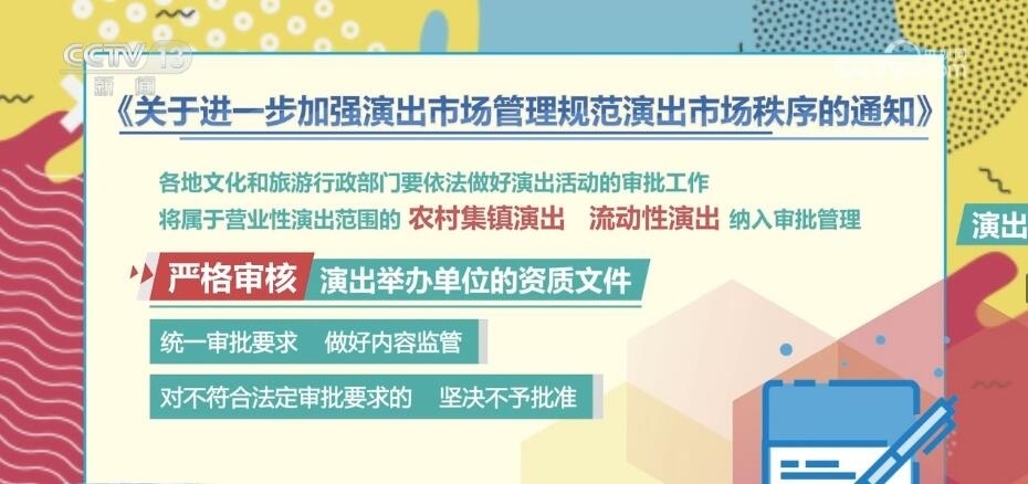 通知指出,各地文化和旅游行政部門要依法做好演出活動(dòng)的審批工作,將屬于營業(yè)性演出范圍的農(nóng)村集鎮(zhèn)演出、流動(dòng)性演出納入審批管理,嚴(yán)格審核演出舉辦單位的資質(zhì)文件,統(tǒng)一審批要求,做好內(nèi)容監(jiān)管。對(duì)不符合法定審批要求的,堅(jiān)決不予批準(zhǔn)。文化和旅游行政部門要定期對(duì)演出場(chǎng)所進(jìn)行檢查,督促演出場(chǎng)所定期開展設(shè)施設(shè)備檢查,落實(shí)安全生產(chǎn)責(zé)任制。督促演出場(chǎng)所建立完善現(xiàn)場(chǎng)巡查制度,指定專人負(fù)責(zé)演出活動(dòng)的巡查,做好現(xiàn)場(chǎng)觀眾管理,堅(jiān)決防止擁擠、踩踏等事故發(fā)生,確保演出現(xiàn)場(chǎng)安全。各地文化和旅游行政部門要將社會(huì)關(guān)注度高、票務(wù)供需緊張的營業(yè)性演出作為重點(diǎn)監(jiān)管對(duì)象,提前進(jìn)行研判。督促演出舉辦單位、演出票務(wù)經(jīng)營單位面向市場(chǎng)公開銷售的營業(yè)性演出門票數(shù)量,不得低于核準(zhǔn)觀眾數(shù)量的70%。對(duì)在票務(wù)經(jīng)營中發(fā)現(xiàn)有炒票問題或可能造成不良影響的,應(yīng)當(dāng)及時(shí)約談演出舉辦單位和演出票務(wù)經(jīng)營單位,督促整改。要聯(lián)合屬地公安、市場(chǎng)監(jiān)管等部門,依法打擊“黃?!背雌薄⑻摷傩麄鞯冗`法違規(guī)行為,切實(shí)保障消費(fèi)者合法權(quán)益。
