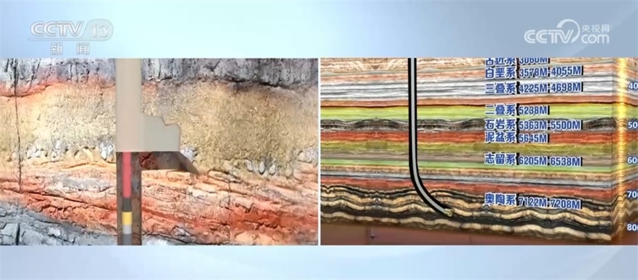 為了讓大家更好地理解鉆井工作,我們借助虛擬技術(shù)制作了一個(gè)地層結(jié)構(gòu)圖。開(kāi)鉆施工后,將從新近系開(kāi)始,陸續(xù)穿越古近系、白堊系、三疊系等,最后到達(dá)奧陶系,總共要經(jīng)過(guò)9個(gè)地層,最后來(lái)到9472米的油層深處。