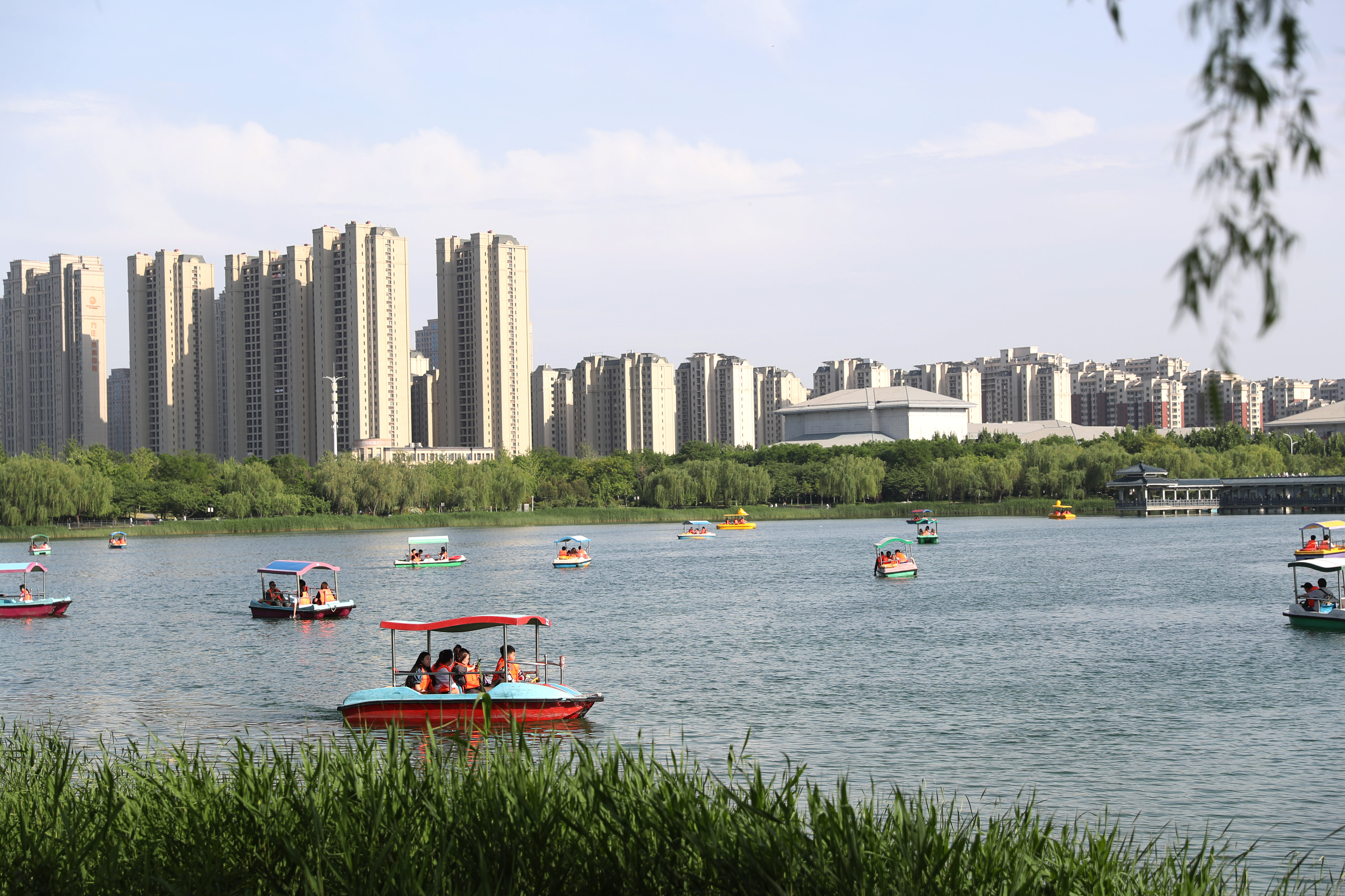 5月2日,游人在山東淄博齊盛湖里泛舟游玩。
