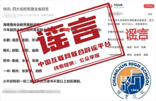 真相:近日,一些網(wǎng)站和自媒體平臺(tái)發(fā)布“今年起,長(zhǎng)郡中學(xué)、雅禮中學(xué)、湖南師大附中、長(zhǎng)沙市一中等長(zhǎng)沙‘四大名?!跎呋謴?fù)全省招生”的信息引發(fā)關(guān)注。5月4日,湖南省教育廳對(duì)此發(fā)布聲明稱,此消息為不實(shí)消息。湖南省自2021年全面規(guī)范普通高中招生,禁止跨區(qū)域招生,并對(duì)違規(guī)招生行為進(jìn)行嚴(yán)肅查處。請(qǐng)大家不信謠不傳謠。(來(lái)源:湖南省教育廳微信公眾號(hào))