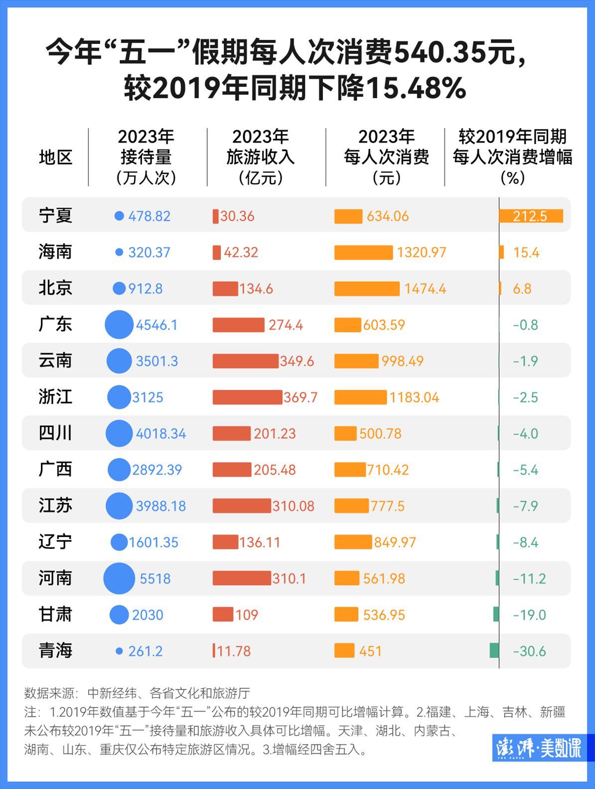 然而,人流井噴的背后,消費(fèi)卻暫未回歸。以文旅部公布的數(shù)據(jù)進(jìn)行計(jì)算,今年“五一”假期每人次消費(fèi)540.35元,較2019年同期下降15.48%。澎湃新聞?dòng)浾哌€統(tǒng)計(jì)了各省的“五一”消費(fèi)成績(jī)單,發(fā)現(xiàn)大部分省市的每人次消費(fèi),較2019年同期皆有所下降。