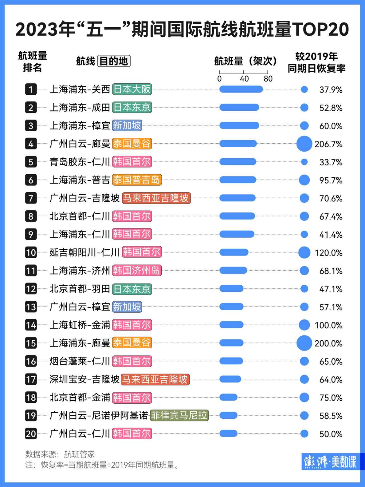 航班恢復(fù)程度也反映了旅游的火熱情況。出境游回歸后,受泰國(guó)游及韓國(guó)游火熱影響,今年“五一”飛往兩國(guó)的航班普遍恢復(fù)較好。