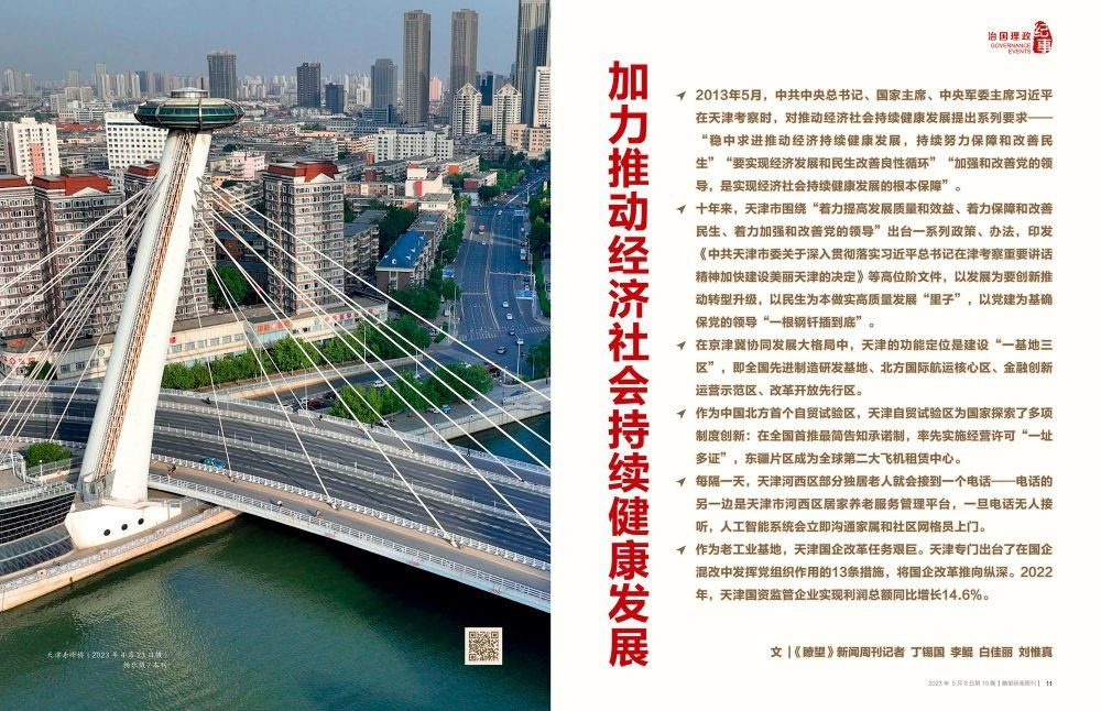 時光回到十年前。2013年5月,中共中央總書記、國家主席、中央軍委主席習(xí)近平在天津考察時,對推動經(jīng)濟(jì)社會持續(xù)健康發(fā)展提出系列要求——“穩(wěn)中求進(jìn)推動經(jīng)濟(jì)持續(xù)健康發(fā)展,持續(xù)努力保障和改善民生”“要實(shí)現(xiàn)經(jīng)濟(jì)發(fā)展和民生改善良性循環(huán)”“加強(qiáng)和改善黨的領(lǐng)導(dǎo),是實(shí)現(xiàn)經(jīng)濟(jì)社會持續(xù)健康發(fā)展的根本保障”。