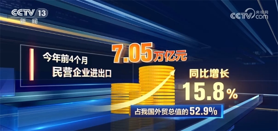 海關統(tǒng)計顯示,今年前4個月,民營企業(yè)進出口7.05萬億元,同比增長15.8%,占我國外貿總值的52.9%。