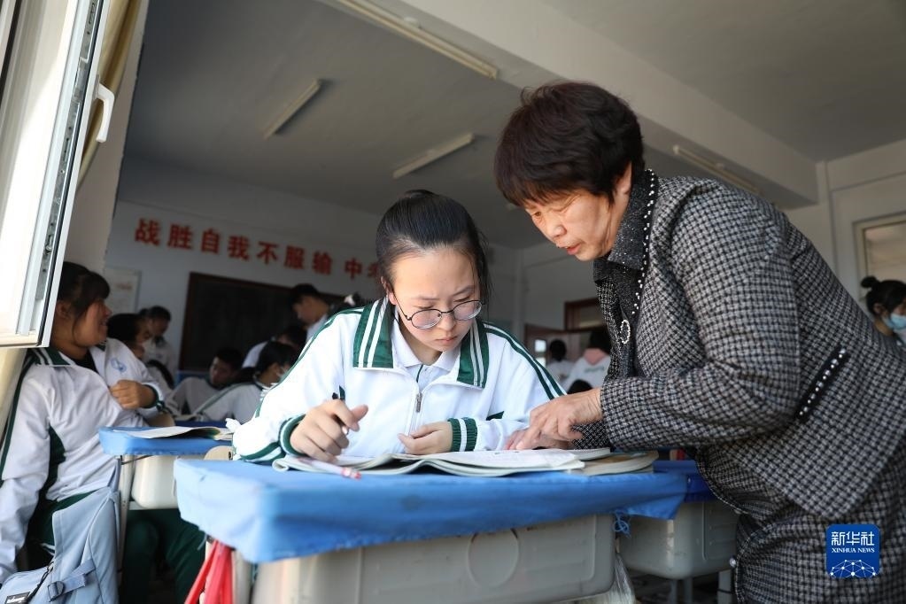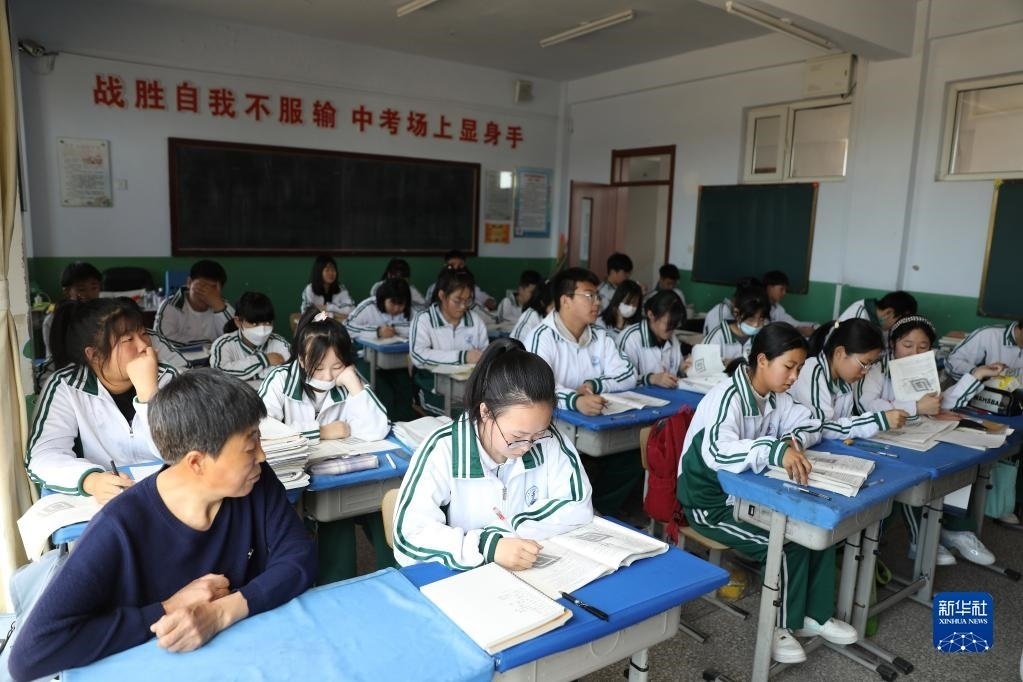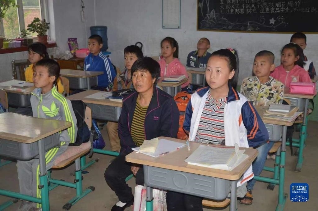 張連琴(左下)和女兒李昕偉在教室內(nèi)聽(tīng)課(5月8日攝)。