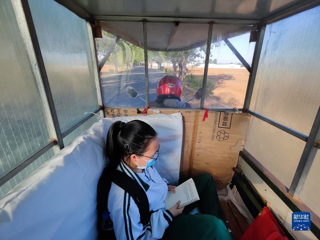 清晨,張連琴騎著電動(dòng)三輪車(chē)?yán)畠豪铌總トド蠈W(xué),女兒在車(chē)棚內(nèi)背誦詩(shī)詞(5月8日手機(jī)拍攝)。