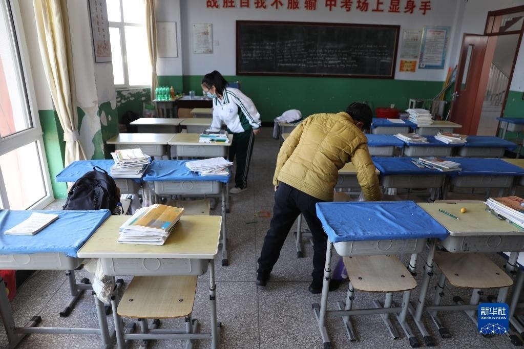 清晨,張連琴和女兒第一個(gè)來(lái)到教室,打掃衛(wèi)生。這是母女倆多年來(lái)每天到校必做的一件事(5月8日攝)。