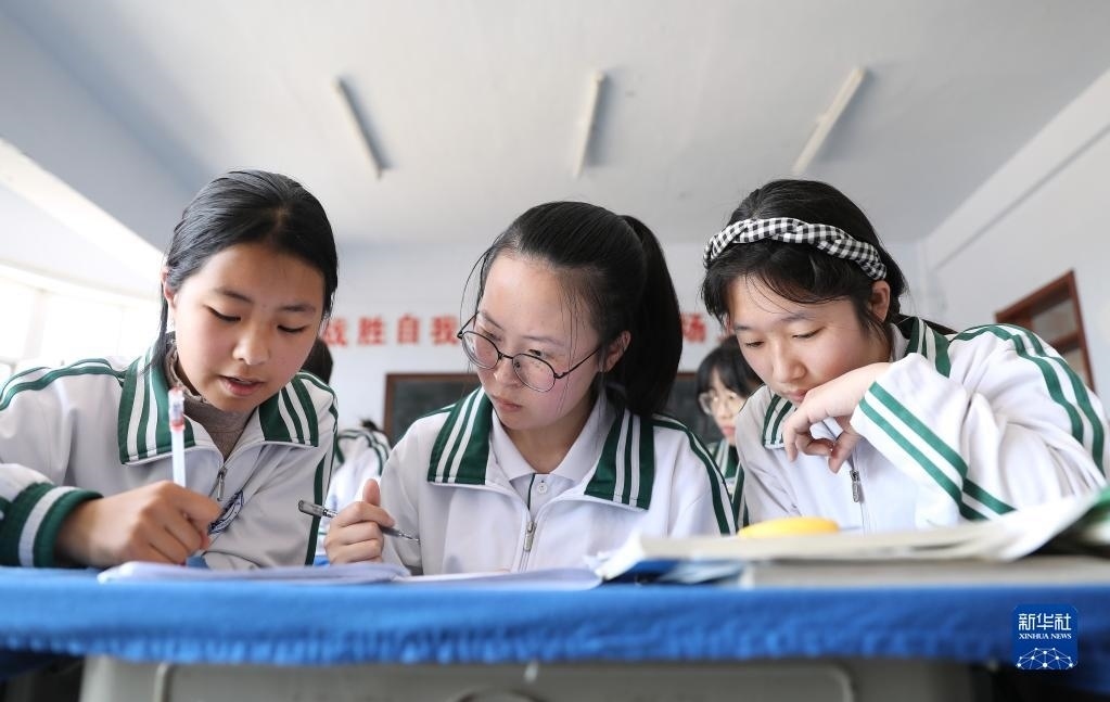女兒李昕偉(中)課間和同學(xué)們交流習(xí)題,由于聽(tīng)不太清,她需要目不轉(zhuǎn)睛地盯著同學(xué)的筆(5月8日攝)。