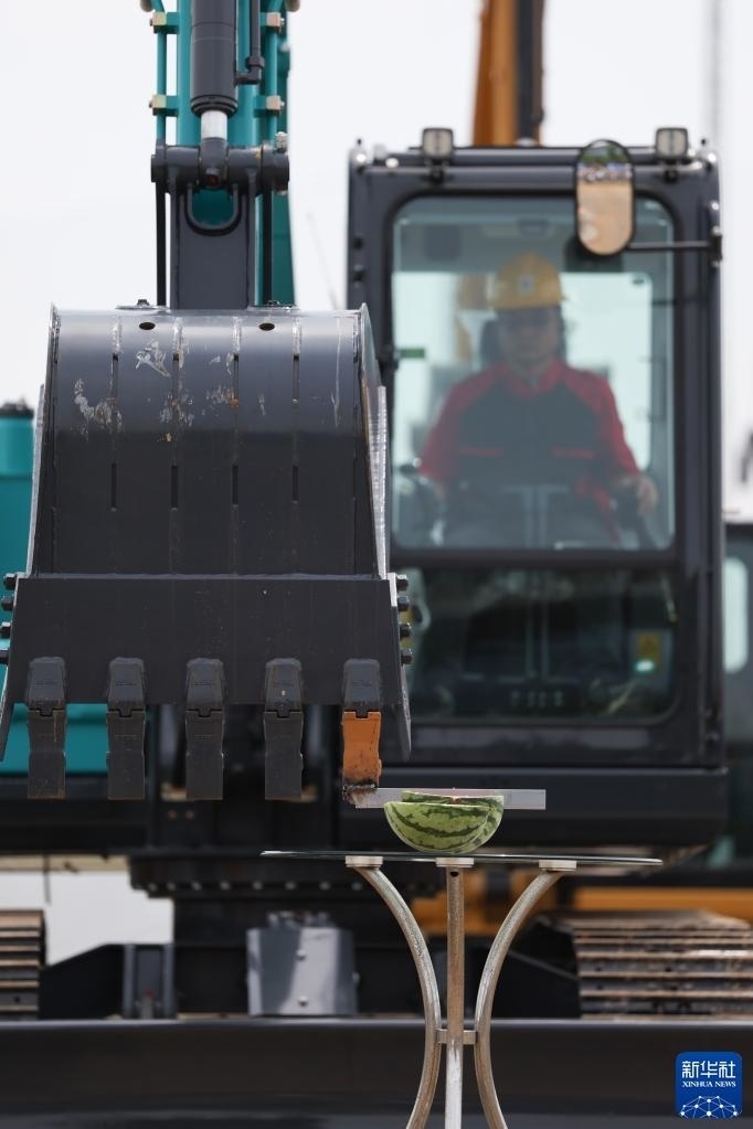 5月13日,在長沙國際工程機械展覽會上,機手駕駛挖掘機切西瓜。