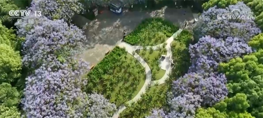 五月的山城重慶,眼下正是藍(lán)花楹盛放的季節(jié),在重慶九龍坡區(qū)彩云湖公園,一叢叢藍(lán)紫色的藍(lán)花楹開得正艷,鈴鐺形的花朵層層疊疊、錯(cuò)落有致。從空中俯瞰,近20株身姿挺拔的藍(lán)花楹圍成一圈,宛如一個(gè)碩大的紫色“愛心”,為公園增添了別樣的浪漫氣息。