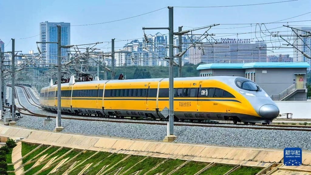 當日 ,CRH380AJ-0203高速綜合檢測列車對貴南高鐵全線進行逐級提速試驗,以時速180公里的速度級,對南寧東至荔波站區(qū)間高鐵沿線的軌道、信號、通信、電務(wù)、綜合接地等多個項目進行檢測。列車因車身涂裝成醒目的黃色,又被稱為“黃醫(yī)生”。
