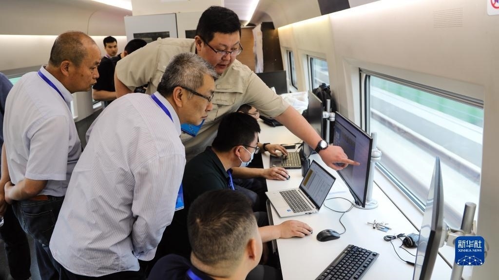 5月16日,在高速綜合檢測列車上,聯(lián)調(diào)聯(lián)試工作人員在分析測試數(shù)據(jù)。