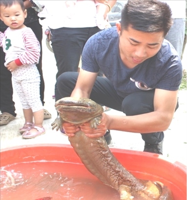 戴莊村民將野生娃娃魚送至野生動(dòng)物保護(hù)站。受訪者供圖