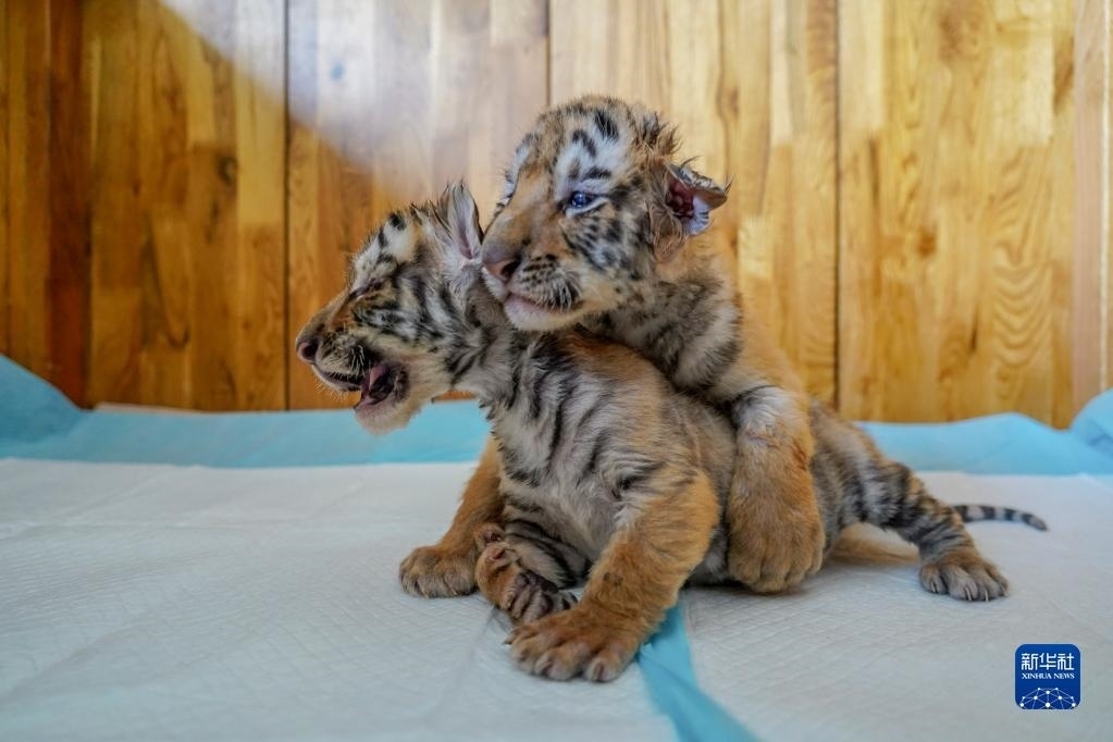 5月22日,在黑龍江東北虎林園的虎舍中,飼養(yǎng)員查看東北虎幼崽生長狀況。