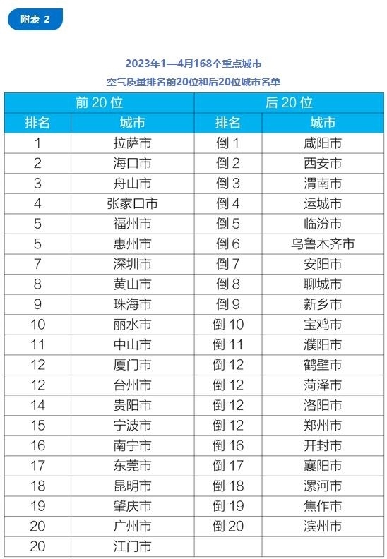 重點城市排名。4月,168個重點城市中,???、拉薩和張家口等城市空氣質(zhì)量相對較好(從第1名至并列第20名);長春、沈陽和哈爾濱等城市空氣質(zhì)量相對較差(從倒數(shù)第1名至并列倒數(shù)第19名)。