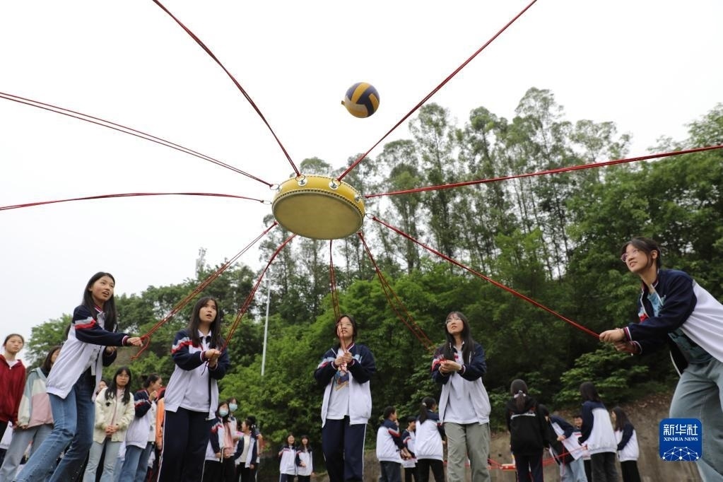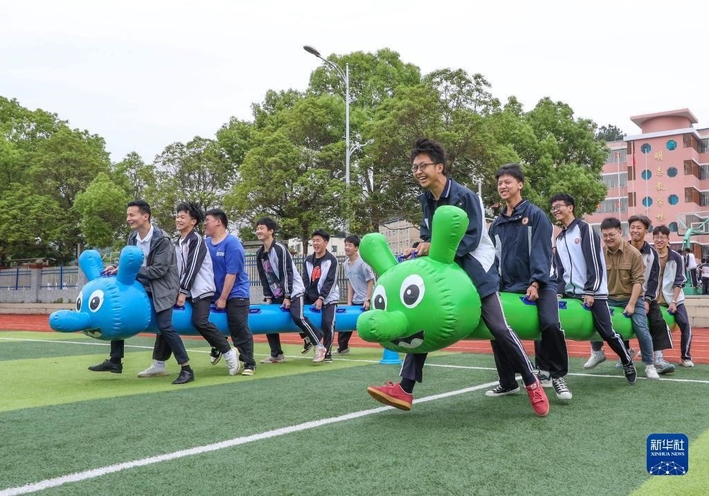 5月24日,在貴州省黔東南苗族侗族自治州岑鞏縣第一中學,高三學生在足球場上做游戲減壓。