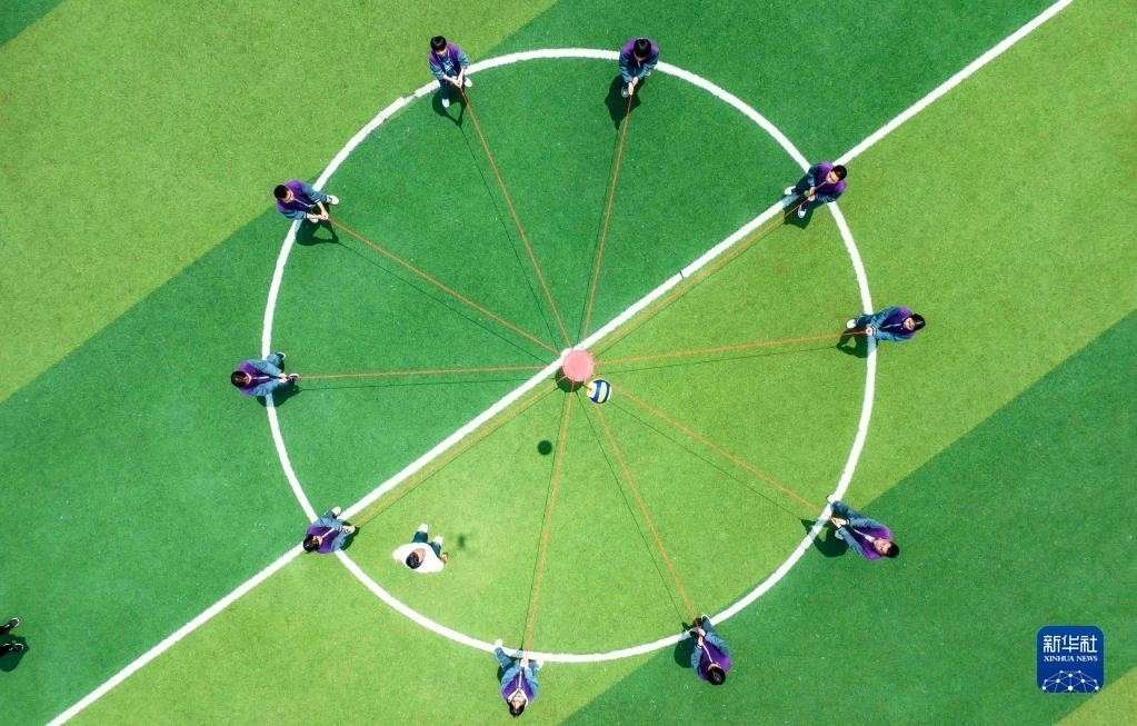 5月24日,貴州省黔西市樹立中學高三學生參加“同心擊鼓”游戲釋放壓力(無人機照片)。