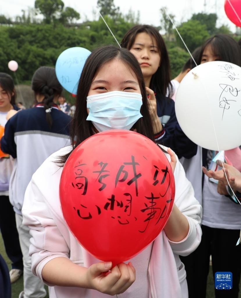 5月23日,在四川省廣安市武勝中學,一名高三學生在氣球上寫下祝福與愿望準備放飛。
