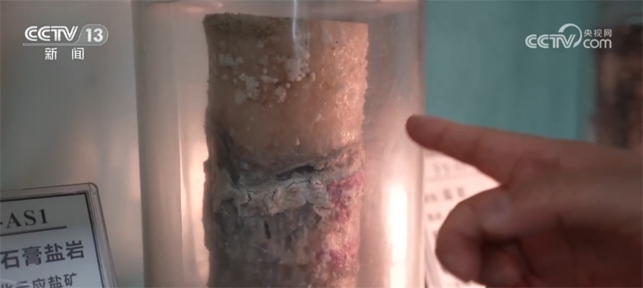 中國科學(xué)院武漢巖土力學(xué)研究所研究員 中國工程院院士 楊春和:這是我們從全國各地采回來的從800米到2000米不等深度下的巖心,上面你看這一塊是鹽,這么一點小薄的夾層是含泥的,這種夾層的界面是否會產(chǎn)生泄漏、對垮塌是否有影響。